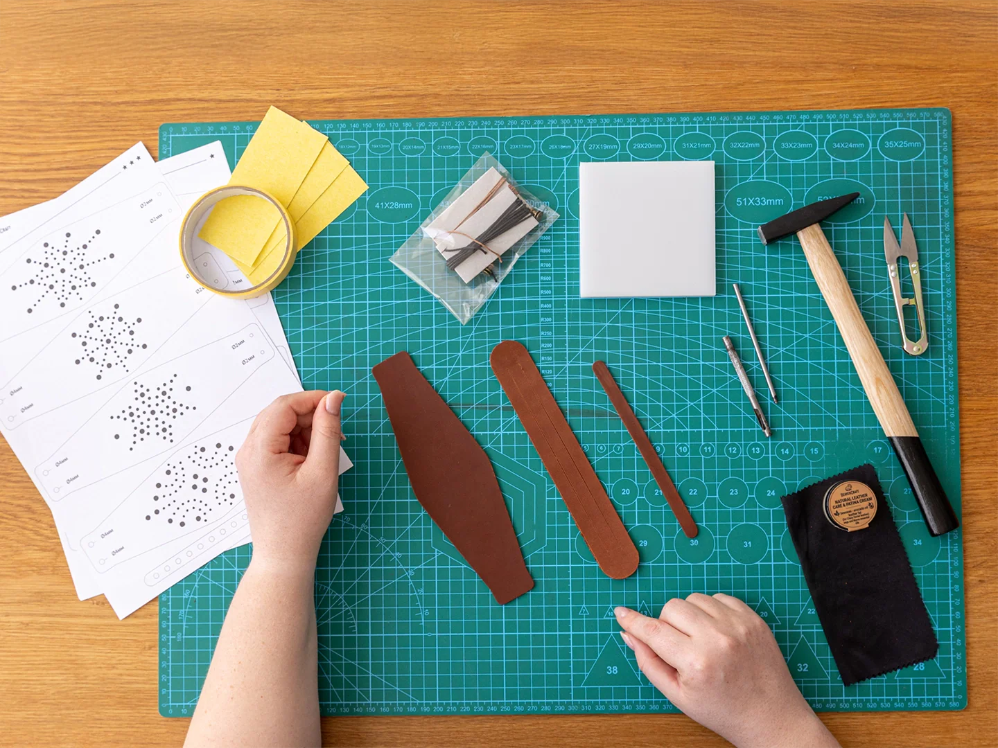 El kit te enseñará a utilizar los punzones, hacer un nudo corredizo, realizar trenzados y tratar el cuero. Con las herramientas incluidas podrás crear pulseras totalmente personalizadas o elegir entre los diferentes diseños decorativos que hemos preparado.