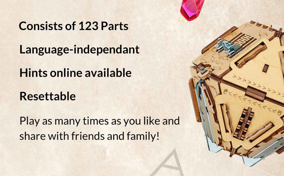 Bērza koksnes un augstas kvalitātes anodēta alumīnija kombinācija piešķir puzles kastītei ļoti unikālu un greznu izskatu. To var atrisināt tikai ar loģikas palīdzību.Lai pārvietotu detaļas vai atvērtu kasti, nav nepieciešams spēks, sišana vai dauzīšana. Rūpīgi meklējiet simbolus un formas uz kastes, lai mēģinātu salikt kopā pavedienus, kas palīdzēs jums to atrisināt. Puzli var arī atiestatīt, tāpēc varat to spēlēt vēlreiz vai paslēpt dāvanu un uzdāvināt draugam.