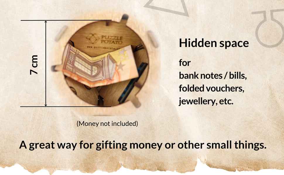 Kastītei ir slepens nodalījums, kurā var paslēpt nelielu dāvaniņu (piemēram, naudas summu, dāvanu karti, nelielu rotaslietu)! Tas padara puzles kastīti par ideālu dāvanu dzimšanas dienās, saderināšanās ballītēs, izlaiduma ballītēs utt.