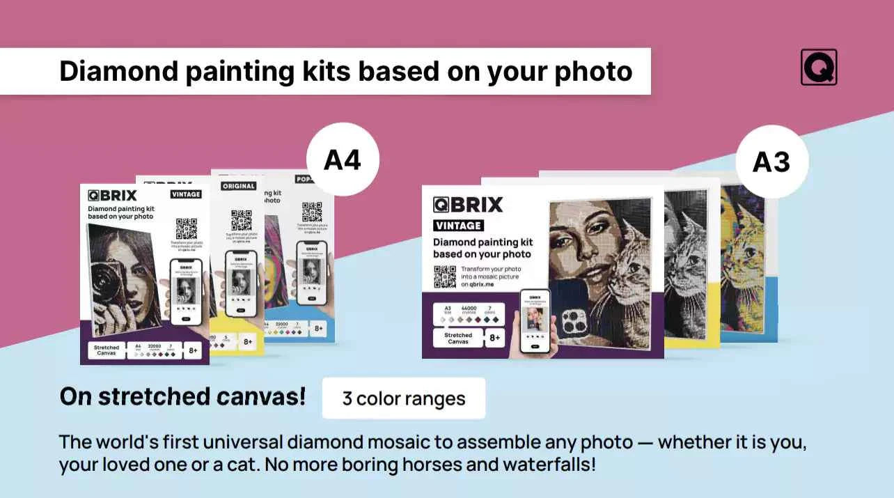 Фото-мозаика QBRIX представлена в трех цветовых решениях: ORIGINAL, VINTAGE и POP-ART. Процесс сборки увлекателен, инструкция подробная и простая, а кристаллы в наборах наилучшего качества!